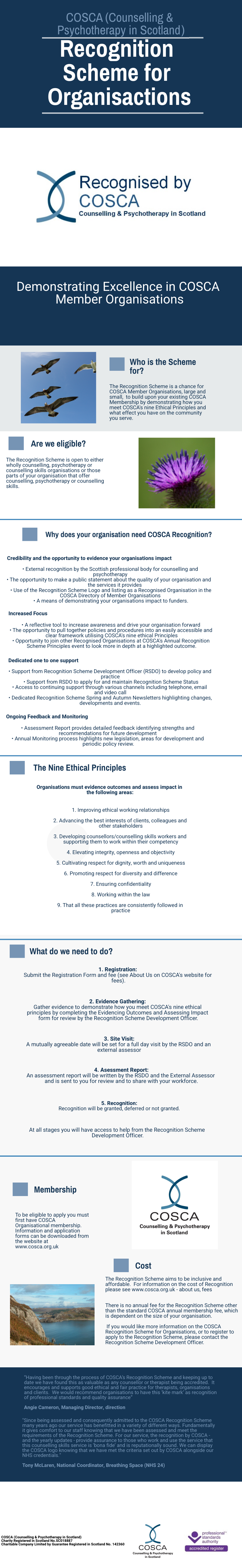 COSCA's Recognition Scheme is a quality assurance Scheme that sets standards for counselling, psychotherapy and counselling skills organisations in Scotland. This leaflet provides an introduction to the Scheme and outlines the benefits of becoming involved.